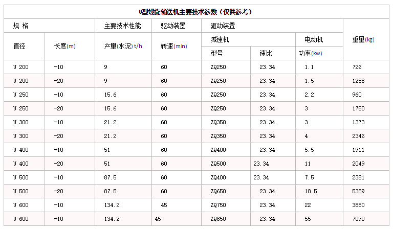 U型螺旋輸送機(jī)主要技術(shù)參數(shù)(僅供參考)