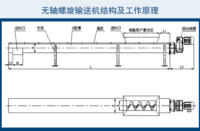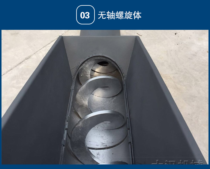 該設(shè)備采用無軸螺旋式,當(dāng)物料從輸送機(jī)的進(jìn)料斗進(jìn)入,依靠螺旋葉片的旋轉(zhuǎn)將物料推移滑行,沿U型輸送槽送至出料口,并與壓榨機(jī)或垃圾小車配套,將物料進(jìn)行下一步處理。