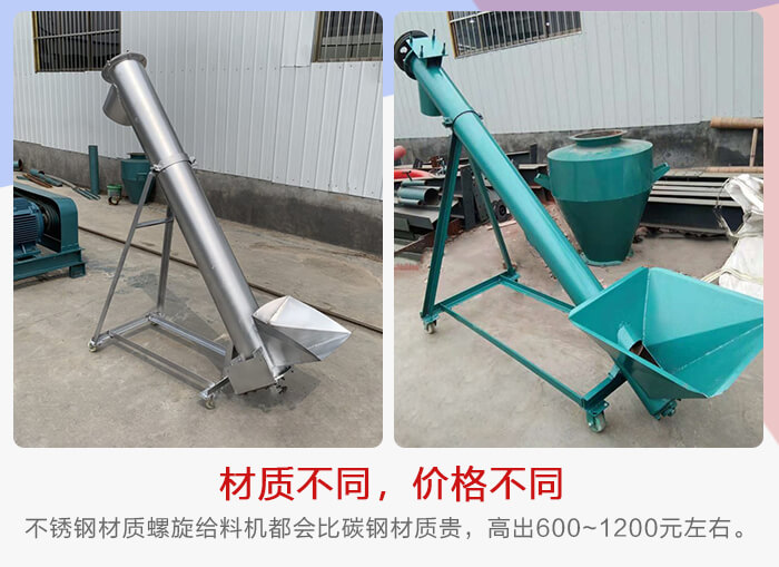 螺旋給料機可以分為碳鋼和不銹鋼材質兩種,由于這兩者材質成本有差異,碳鋼螺旋給料機適合普通物料輸送,不銹鋼螺旋給料機主要用于輸送機一些腐蝕性、高溫物料,也用于食品、醫(yī)藥等對輸送環(huán)境有衛(wèi)生標準的行業(yè),所以不銹鋼材質螺旋給料機都會比碳鋼材質貴,一般會高出600~1200元左右。