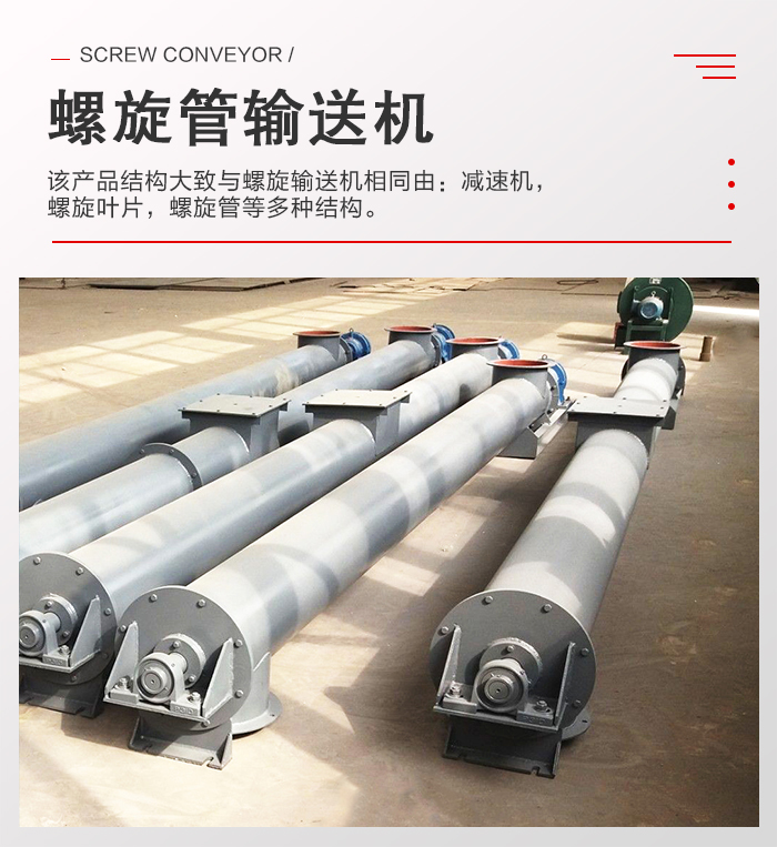 螺旋管輸送機(jī)就是螺旋輸送機(jī),準(zhǔn)確的說是管式螺旋輸送機(jī)。該設(shè)備整體由圓管構(gòu)成,所以很多人稱之為螺旋管輸送機(jī)。該產(chǎn)品結(jié)構(gòu)大致與螺旋輸送機(jī)相同由:減速機(jī),螺旋葉片,螺旋管等多種結(jié)構(gòu)。