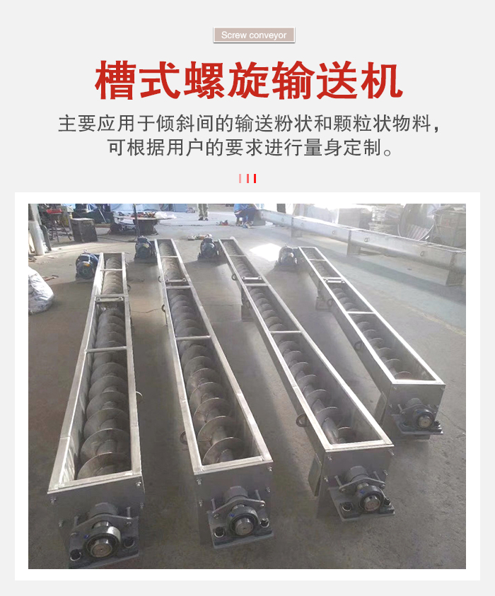槽式螺旋輸送機是農(nóng)業(yè)各部門]機械化運輸工作的主要機組,可使運輸工作減輕勞動強度,提高工作效率,應(yīng)用范圍很廣。槽式螺旋輸送機適用于各行業(yè),如建材、化工、電力、冶金、煤炭、糧食等行業(yè),適用于水平或傾斜輸送粉狀、粒狀和小塊狀物料,如煤、灰、渣、水泥、糧食等。