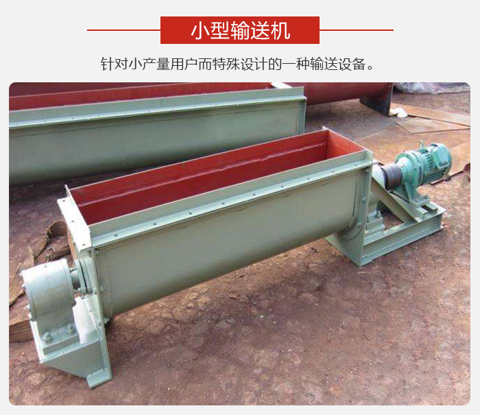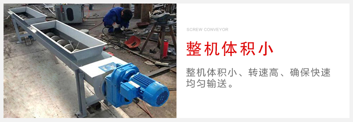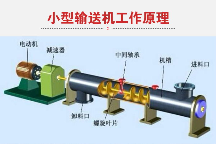 小型旋輸送機主要有傳動裝置、進料口、螺旋軸、輸送管、出料口等部件組成。水平螺旋輸送機是利用旋轉的螺旋將被輸送的物料沿固定的機殼內推移而進行輸送工作,頭部及尾部軸承移至殼體外,吊軸承采用滑動軸承設有防塵密封裝置,軸瓦一般采用粉末冶金,輸送水泥采用毛氈軸瓦,吊軸和螺旋軸采用滑塊連接。